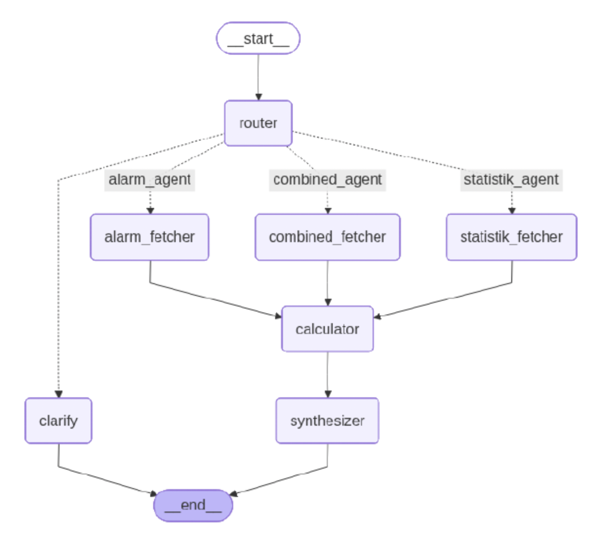 Abbildung: Multi-Agent-Architektur mit Routing, Datenbeschaffung, Berechnung und Antwortsynthese.